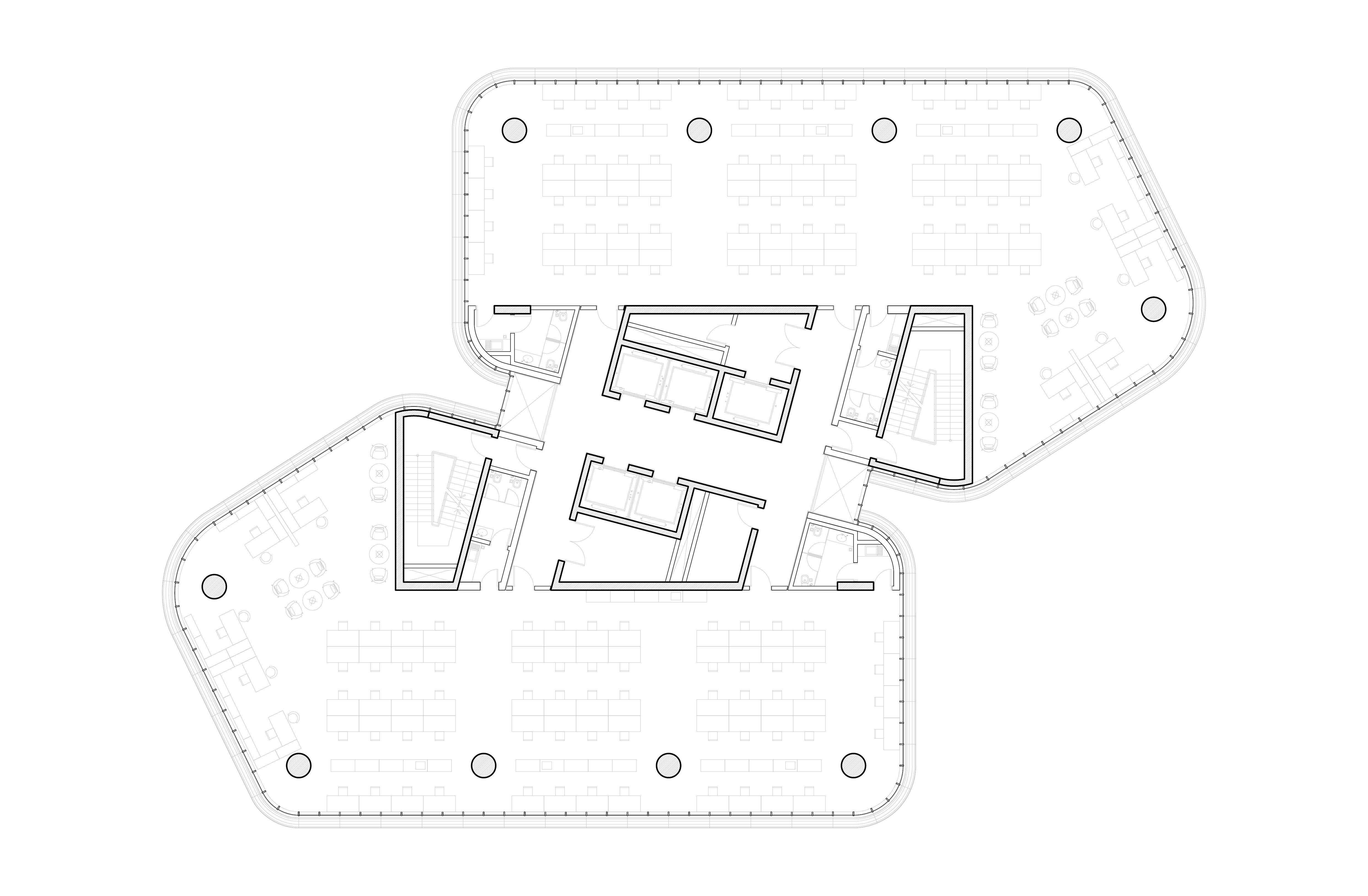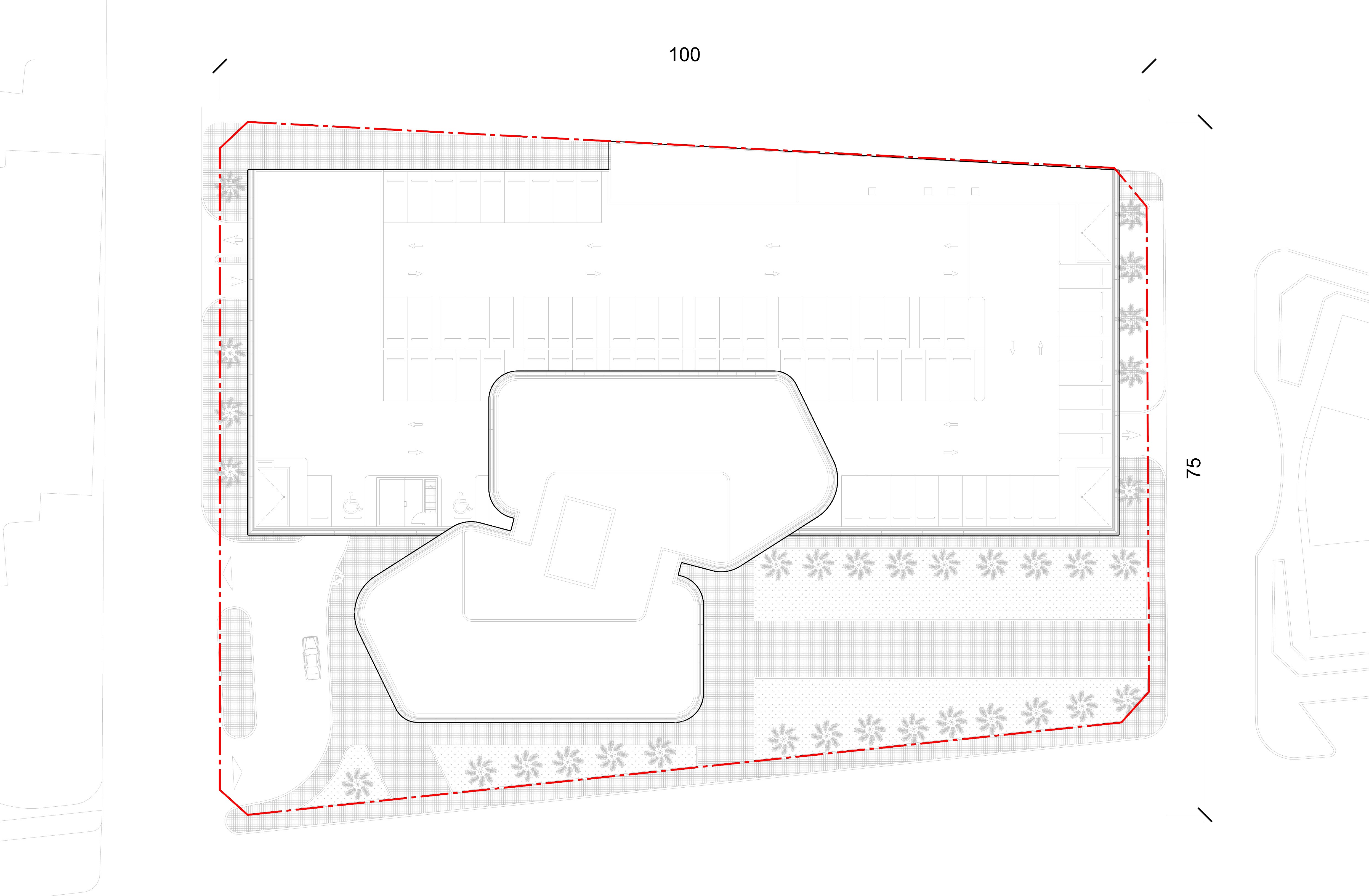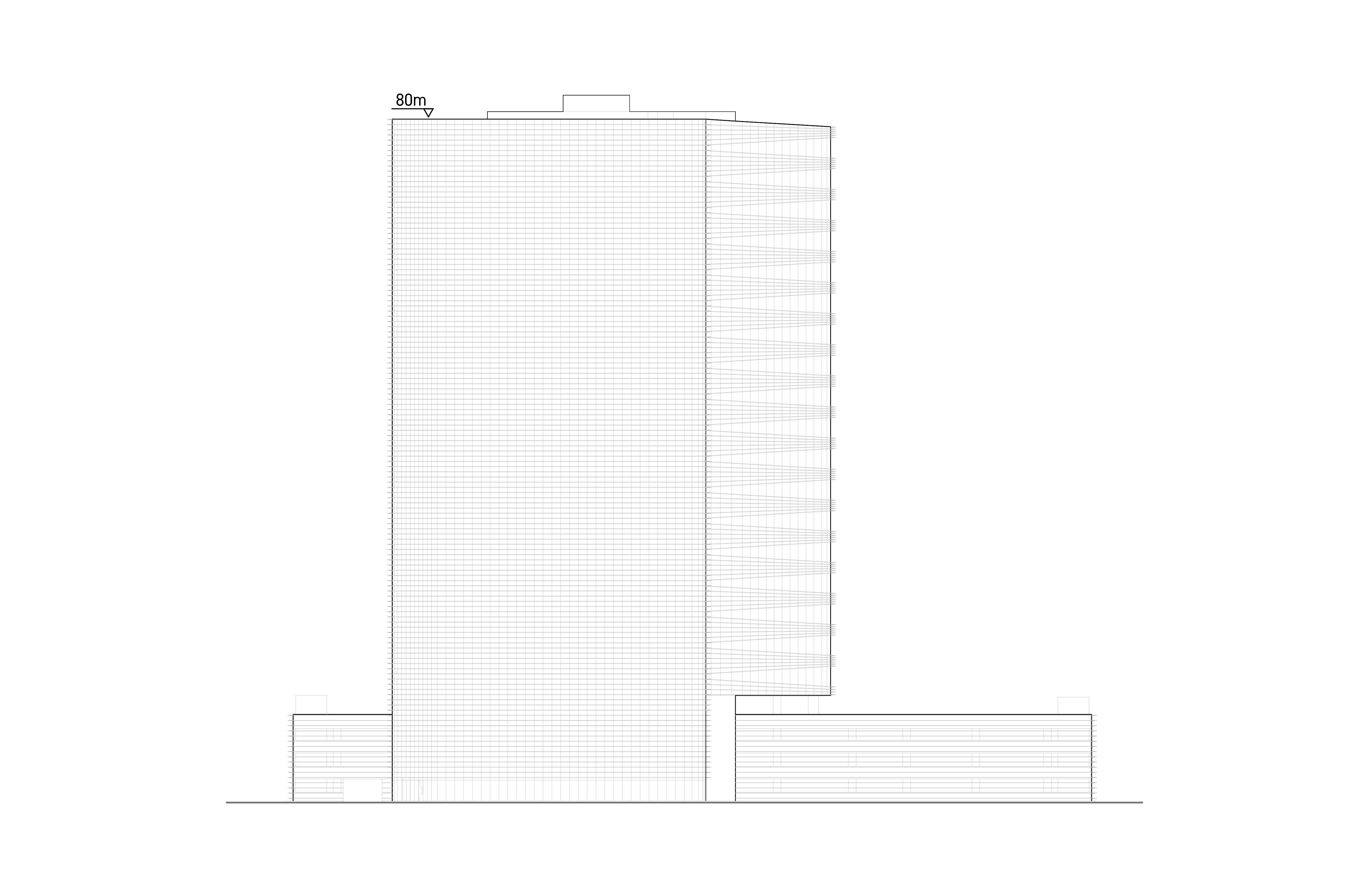 Al Khair Tower is an office development in Jeddah composed of two rectilinear volumes with softened, filleted edges, giving the building a refined and streamlined presence. The rear volume is elevated on a podium that accommodates an above-ground multi-storey car park, forming a clear functional base for the tower.