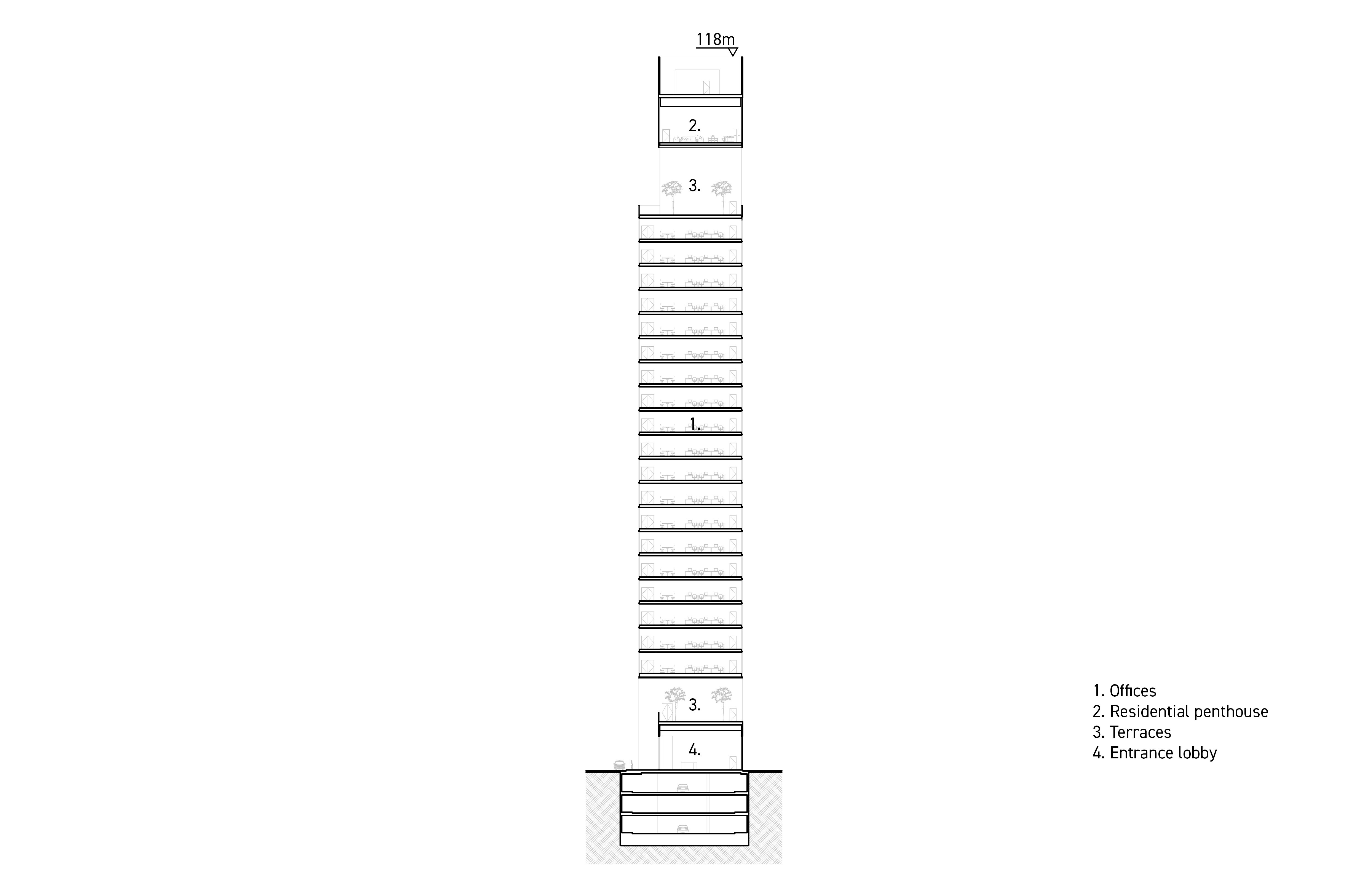 Al Nakhlah Tower is a mixed-use development in Riyadh, primarily conceived as an office tower with a VIP residential penthouse occupying the uppermost floors. Located in close proximity to the King Abdullah Financial District (KAFD), the project responds to its urban context through a clear and disciplined architectural expression.