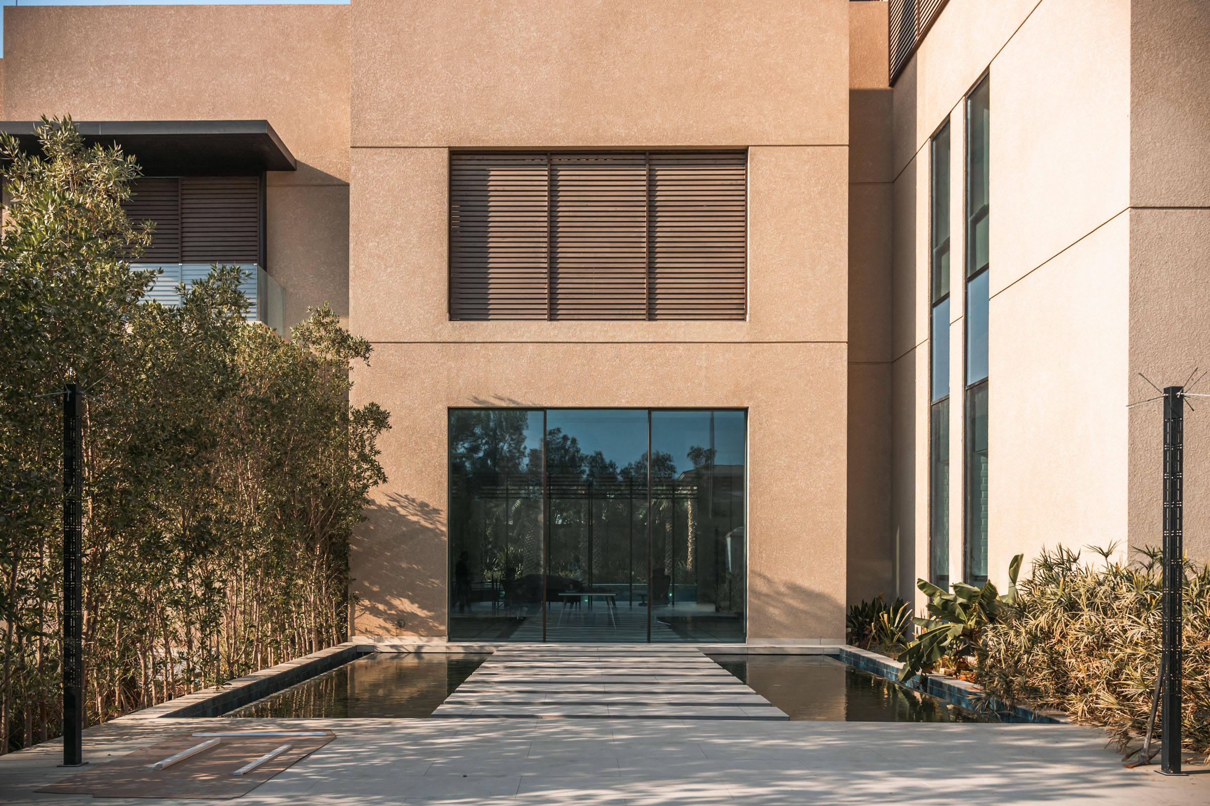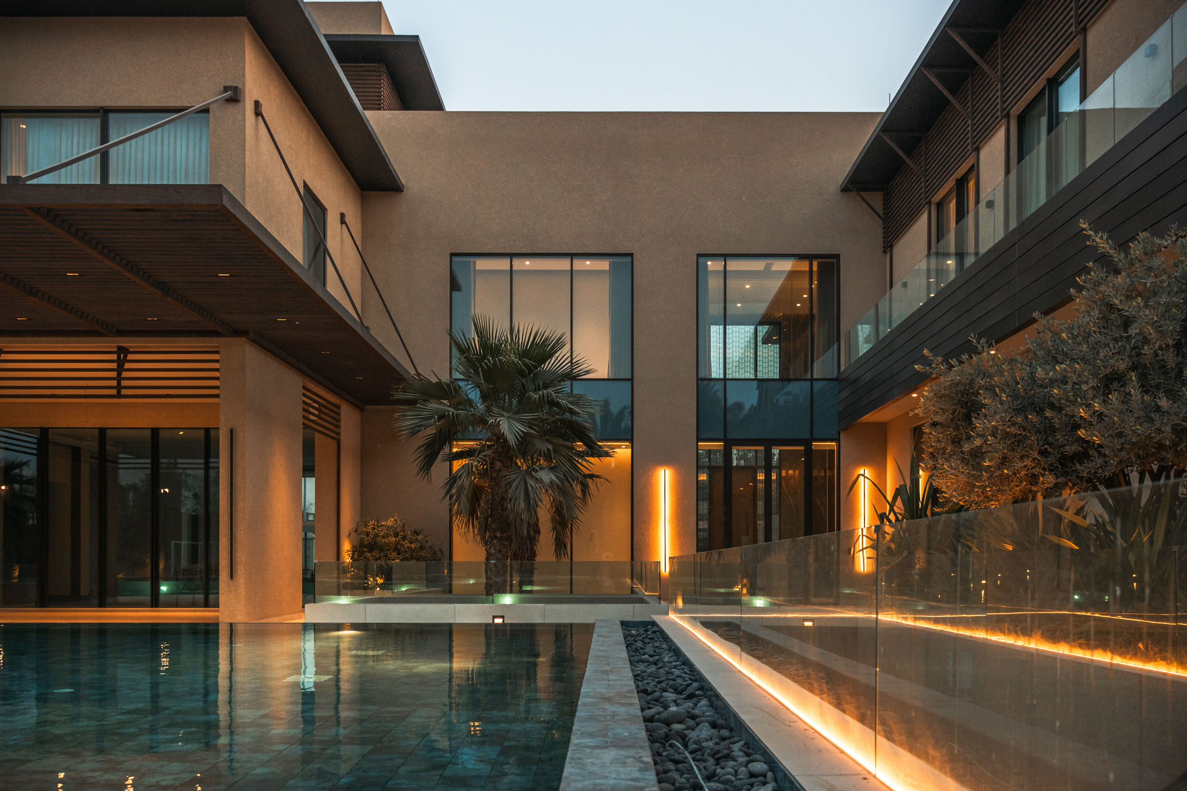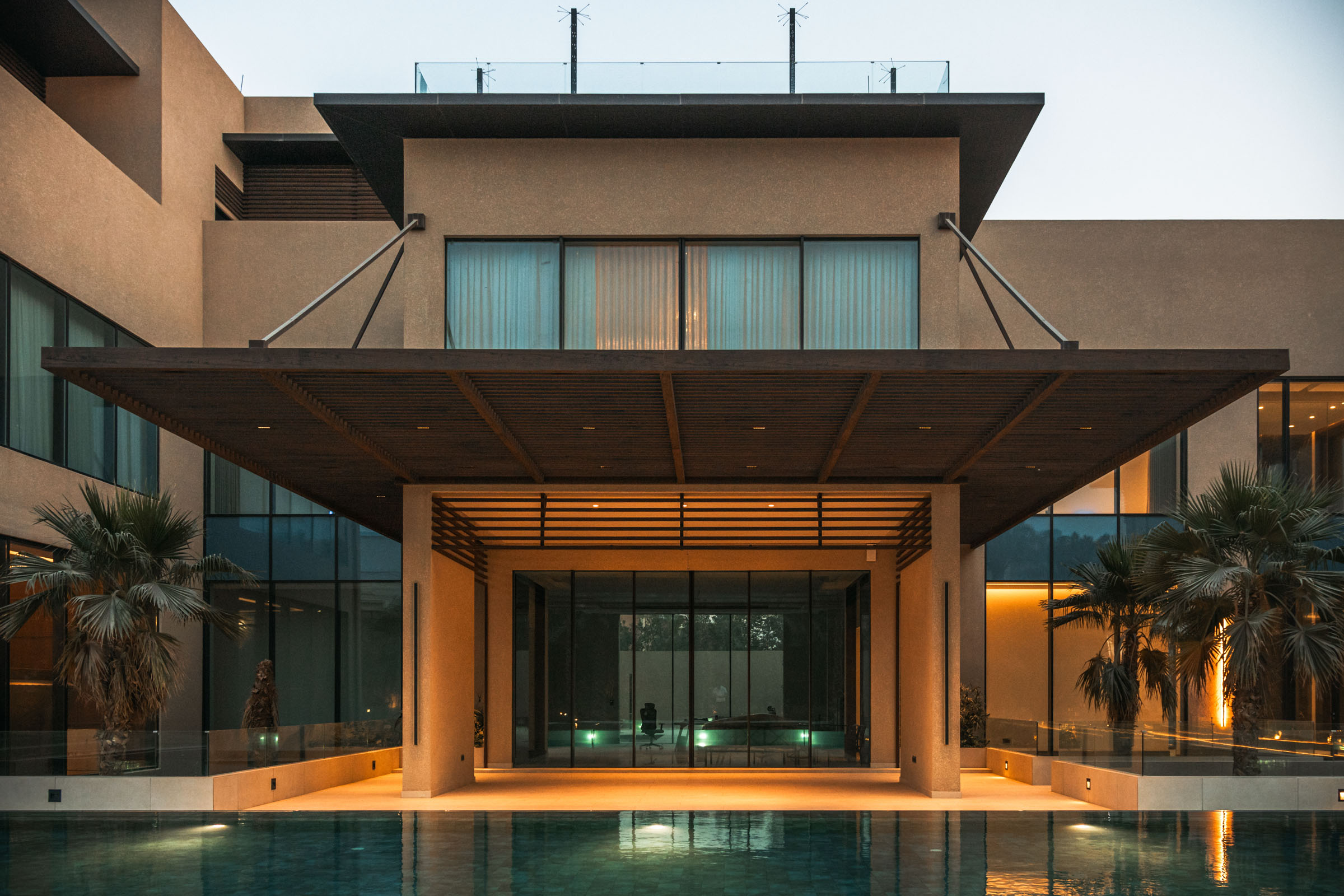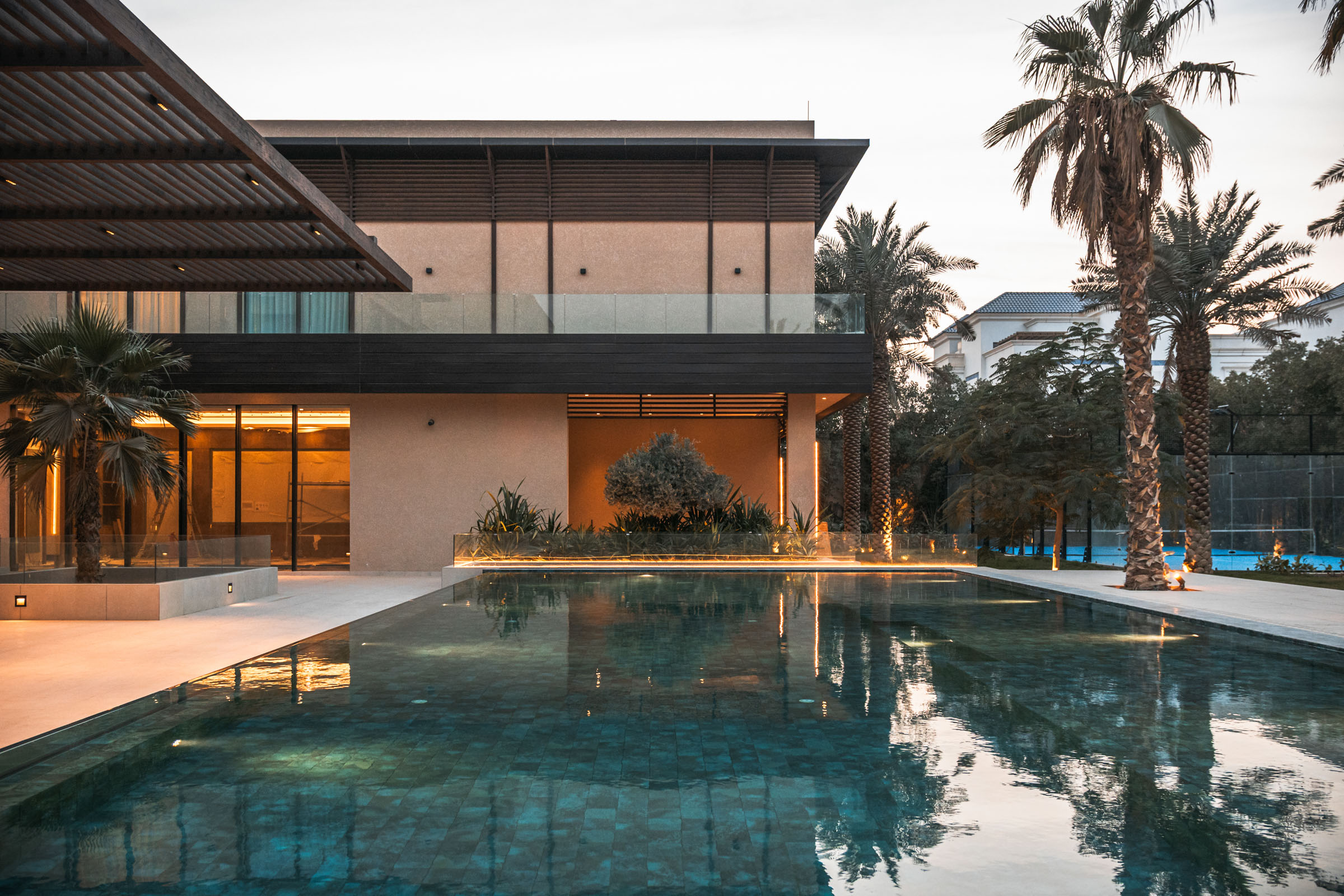 YA Villa is a 2,500 m² private residence in Riyadh, organised around a central swimming pool that acts as the spatial and visual core of the house. The primary living spaces are oriented inward, with views and movement consistently drawn towards this central outdoor element.