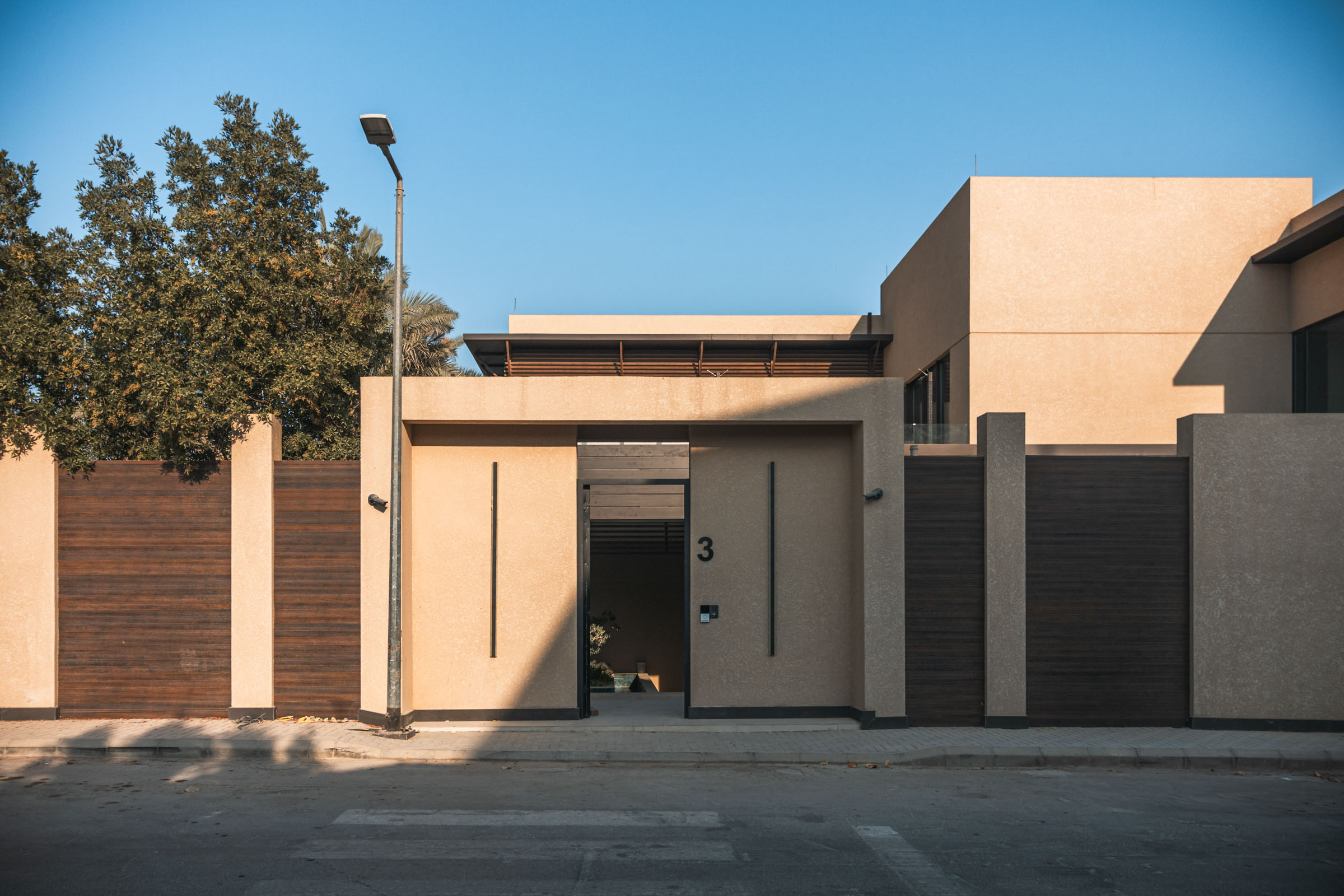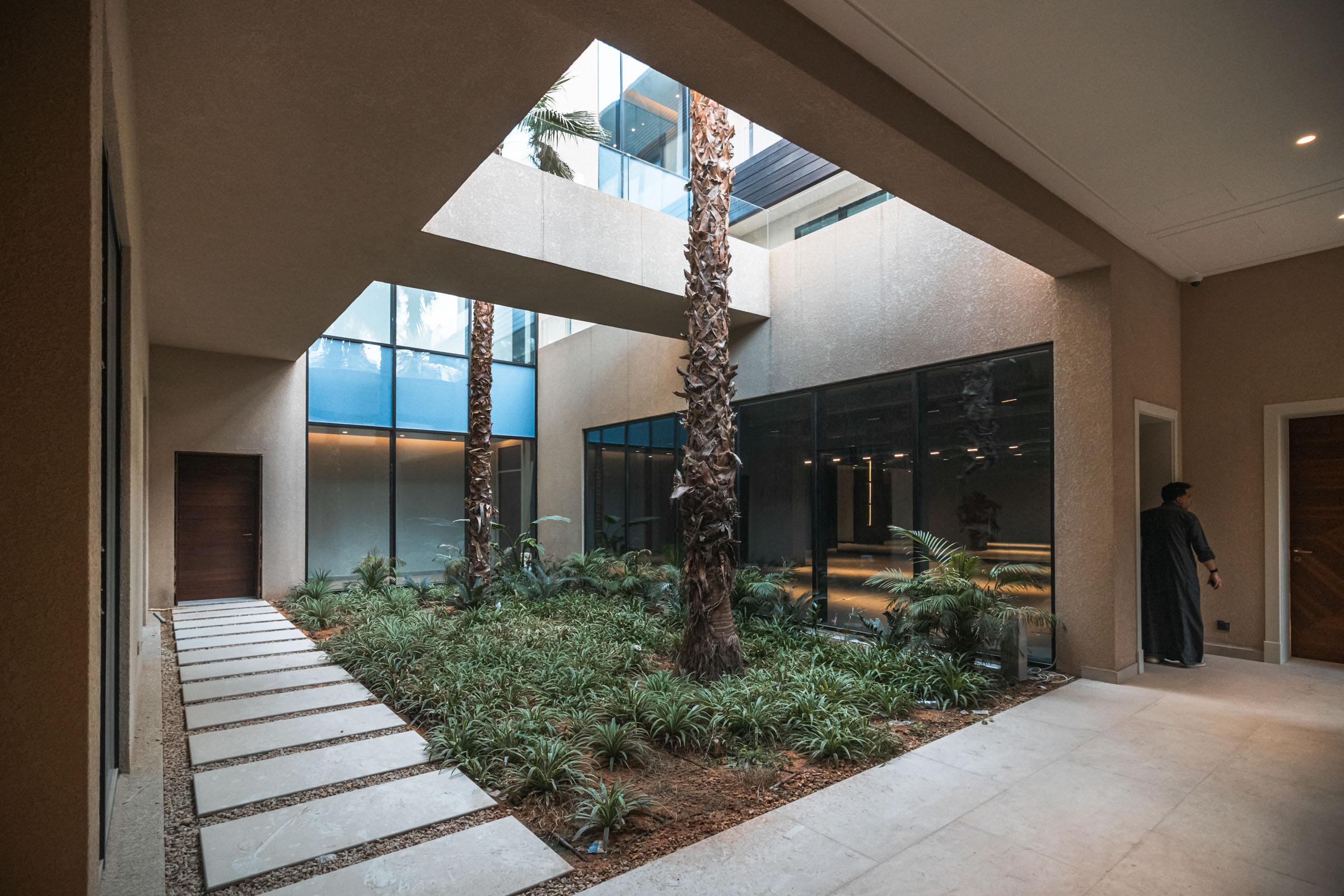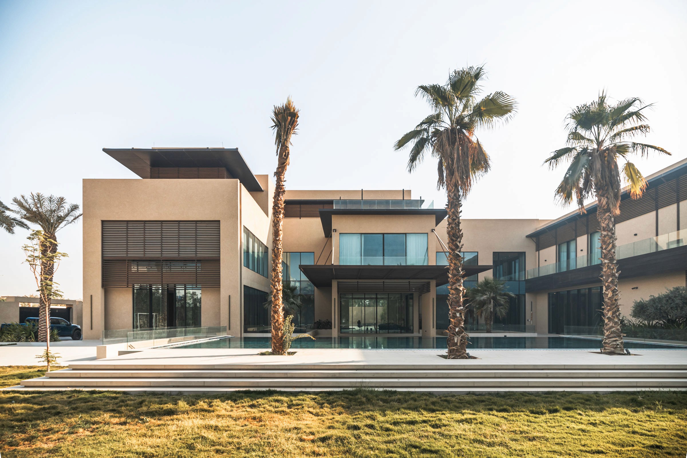 YA Villa is a 2,500 m² private residence in Riyadh, organised around a central swimming pool that acts as the spatial and visual core of the house. The primary living spaces are oriented inward, with views and movement consistently drawn towards this central outdoor element.